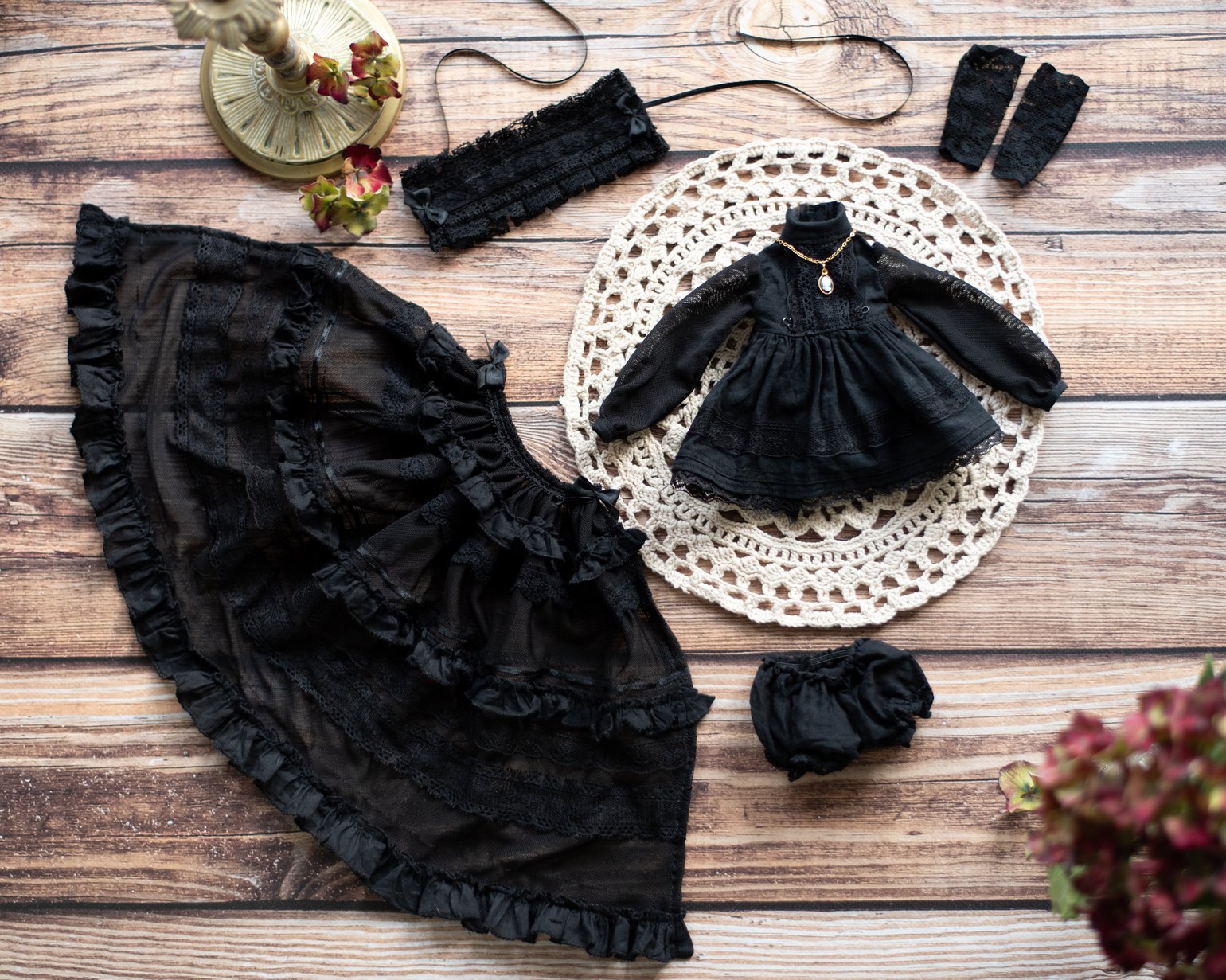 This set is made of a base cotton dress, a tulle "overskirt", a pair of black bloomers, a pair of lace legwarmers and a black headband ; everything is decorated with some lace and silk ribbons.